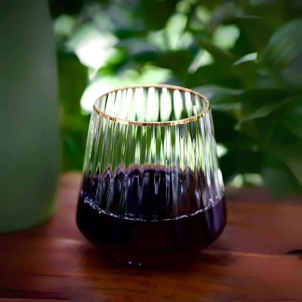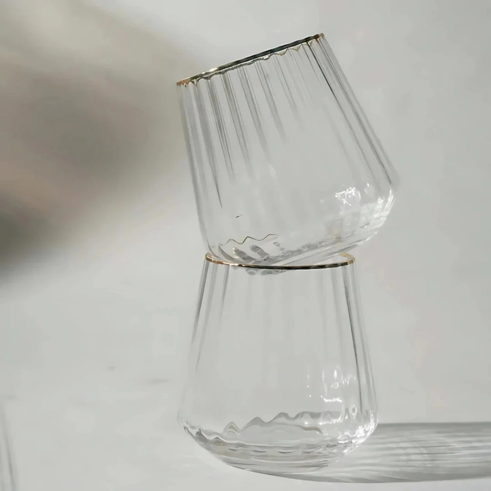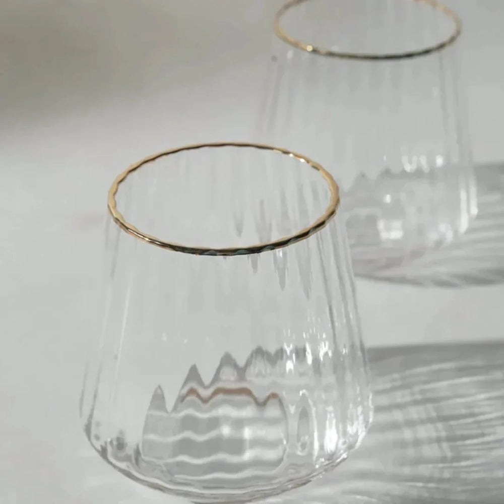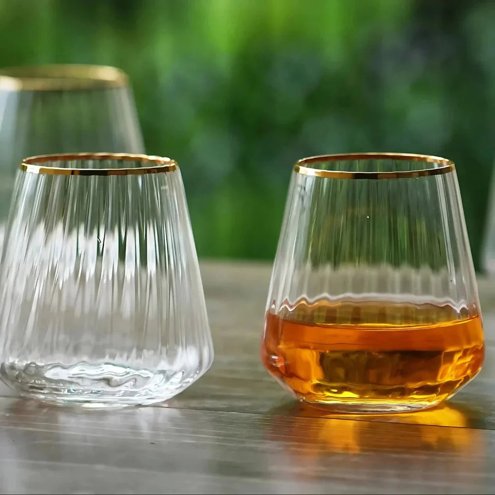 Made from high-quality, lead-free glass, each tumbler features a sleek, crystal-clear finish complemented by a shimmering gold rim. The minimalist yet elegant design ensures it seamlessly fits into any barware collection.