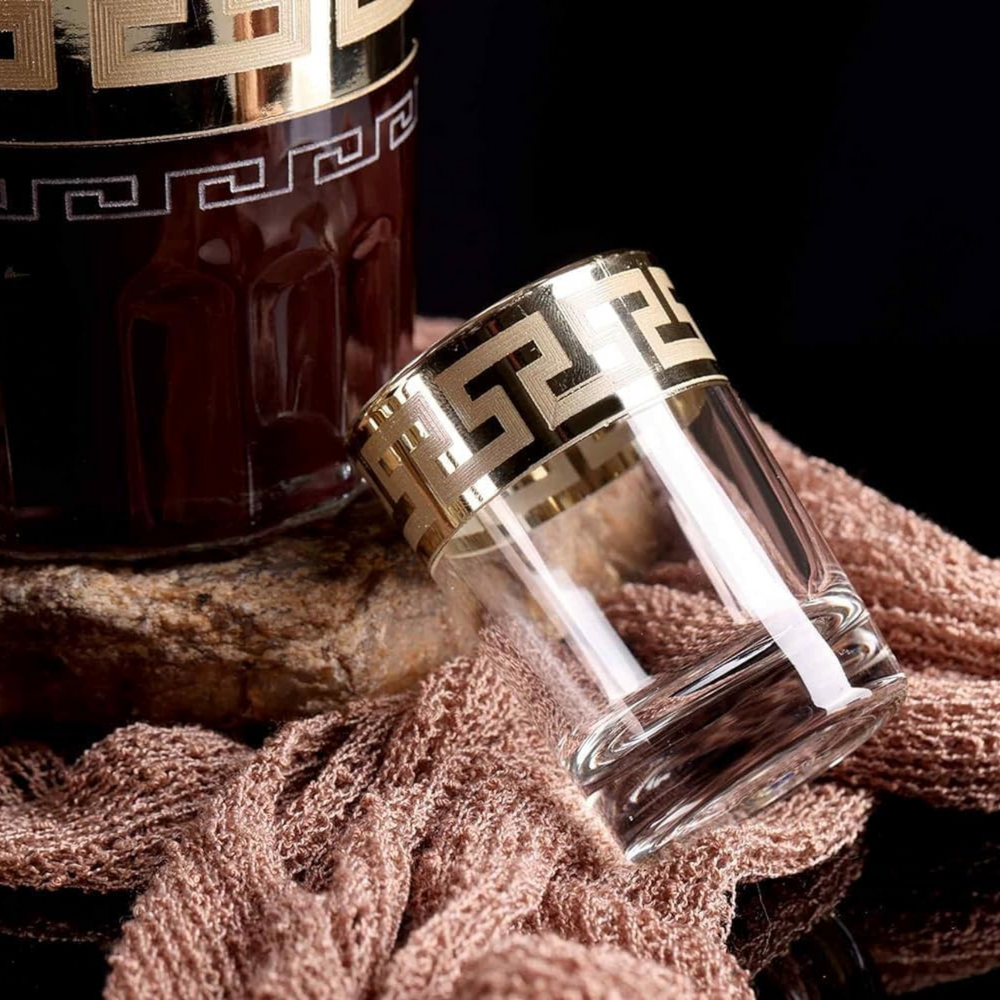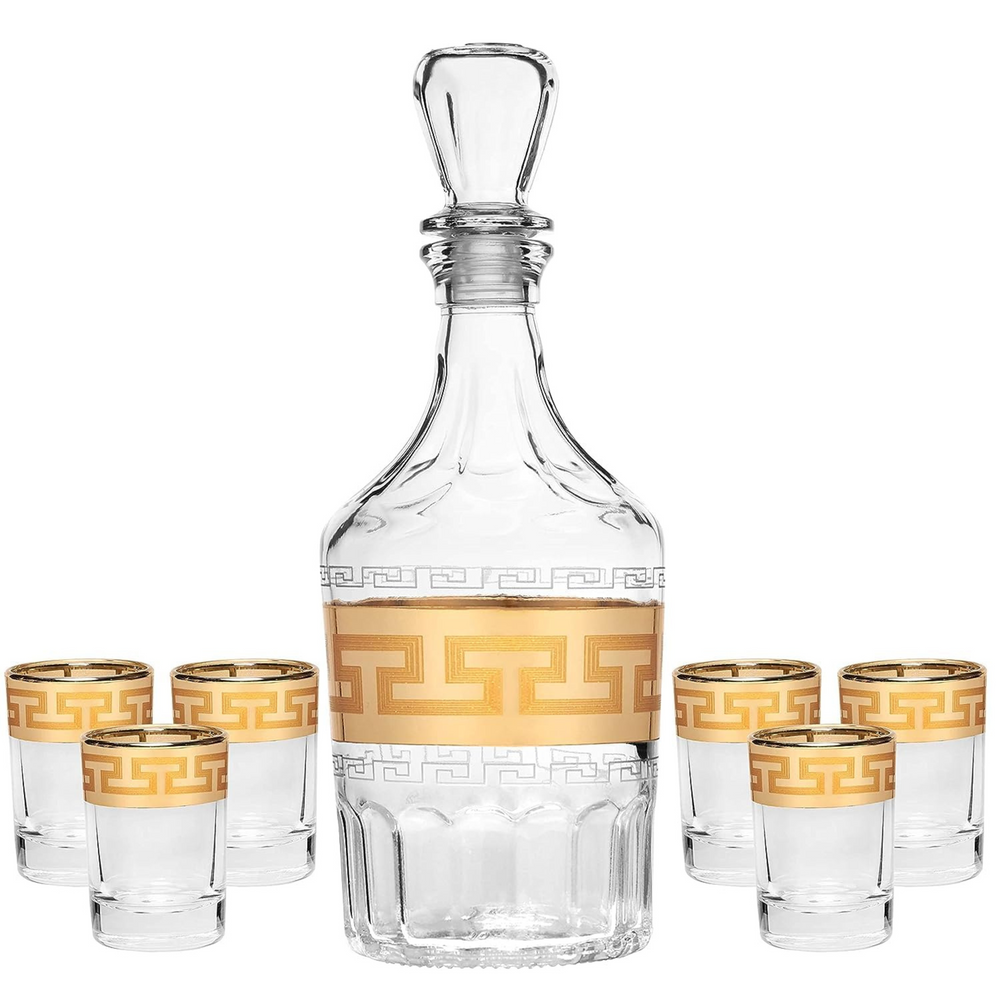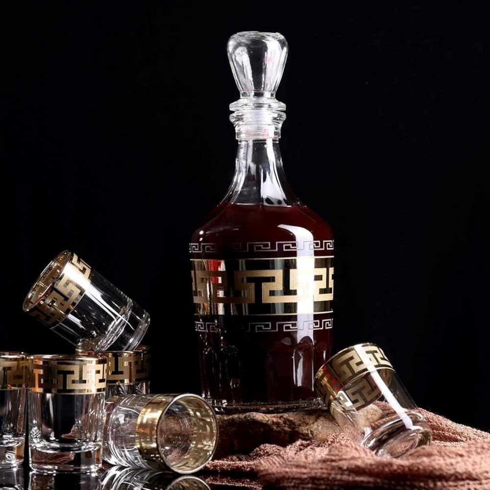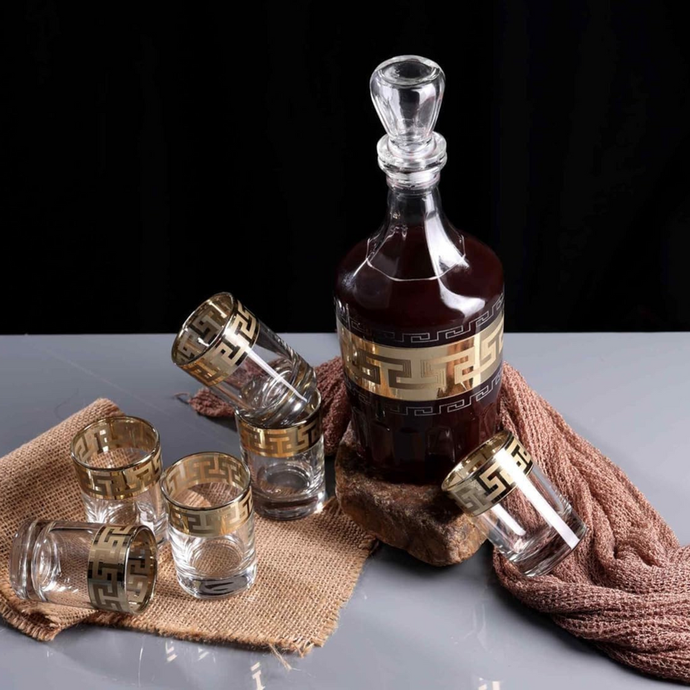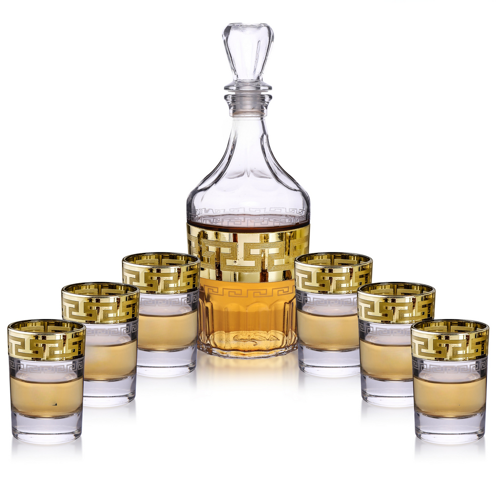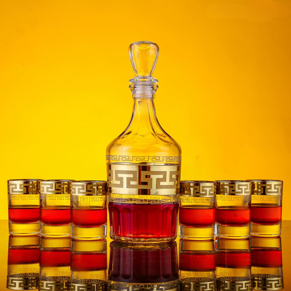 • This elegant and unique Pattern Gold Plated Shot Glass decanter set, classically designed with exceptional brilliance clarity, and weight into each piece, are a must have for the whisky connoisseurs and anyone else who appreciate the nobility of the spirit and wants to bring new luster to their house bar. club, or office.