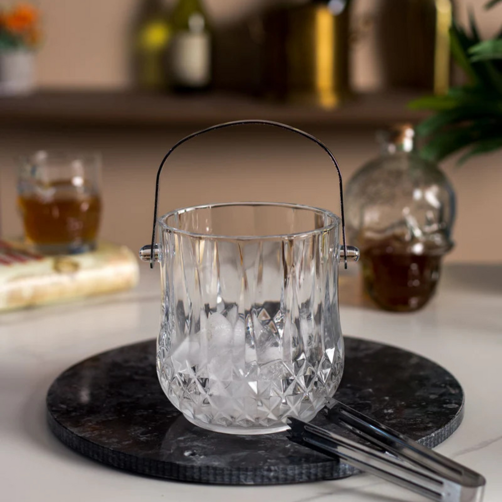 Serve your guests in style with this artisan ice bucket. Its modern shape, made from glass, makes a dramatic visual impact on your buffet or bar, and it comes with an equally artistic scoop that hangs perfectly from the side of the bucket for easy serving. The bucket comes with handle for a secure carrying grip and a lid to keep the ice cooler for longer. Let's get the party started!