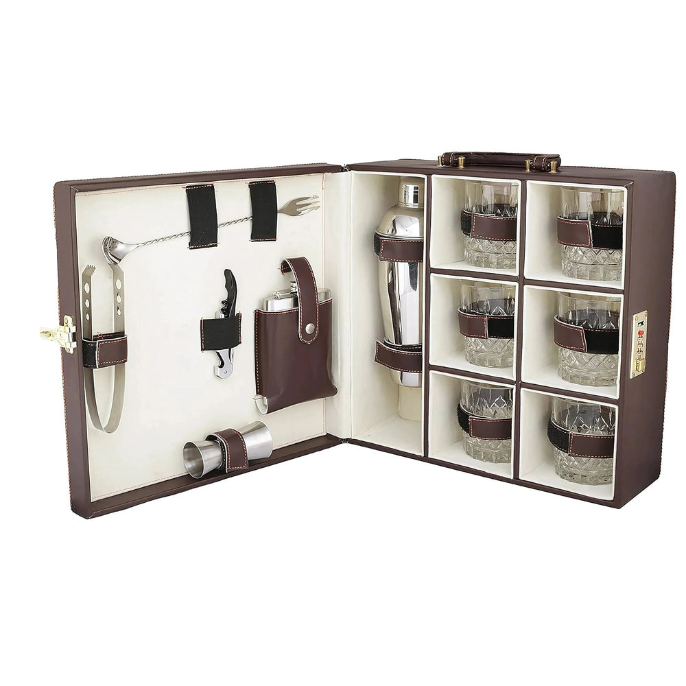 Indulge in the perfect blend of elegance and functionality with our Bar Box Set – Medium Variant. Thoughtfully crafted for those who love to enjoy and share their favorite drinks, this set offers a premium selection of bar essentials, all beautifully housed in a sophisticated leather briefcase. Ideal for home use or on-the-go enjoyment, this set allows you to bring a touch of luxury wherever you go.